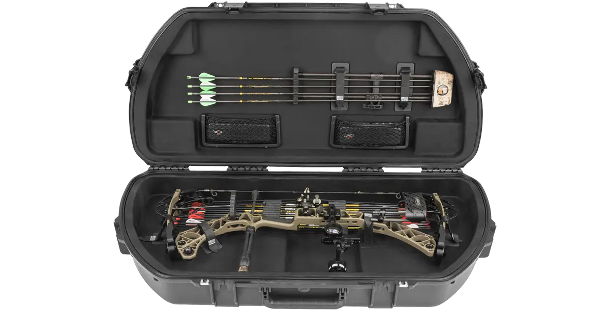 Featuring the same waterproof, virtually-indestructible, military-grade construction of all SKB iSeries cases, but with an innovative curved bow shape that reduces weight and provides a more compact footprint. The 3i-4318-PL fits bows up to 41” long and 17” wide and includes hook-and-loop tie-downs for a secure fit, storage below the bow for a dozen arrows, lid storage for a quiver, and two mesh pockets.