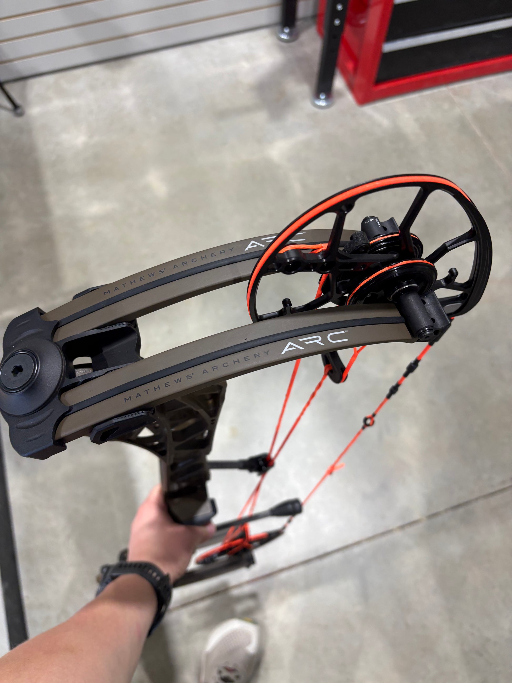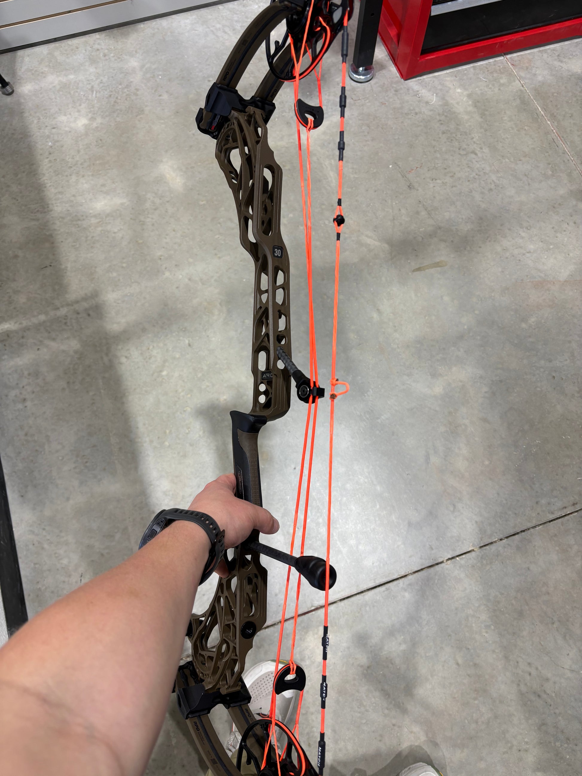 ARC 30 in Kodiak Brown finish with Custom Flo orange Match bowstrings